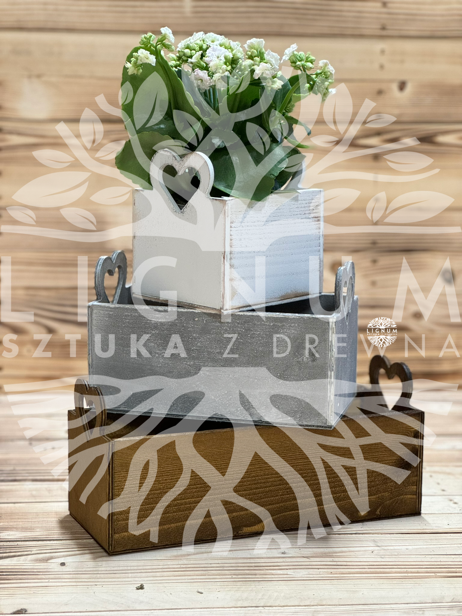 Skrzynka idealnie nadaje się jako osłonka na kwiaty do domu, jak i ogrodu. Z oby dwóch boków posiada element dekoracyjny w kształcie serduszka. Artykuł drewniany, wykonany ręcznie. Możliwe pęknięcia, nierówności. Dostępny w trzech kolorach oraz w trzech rozmiarach.
