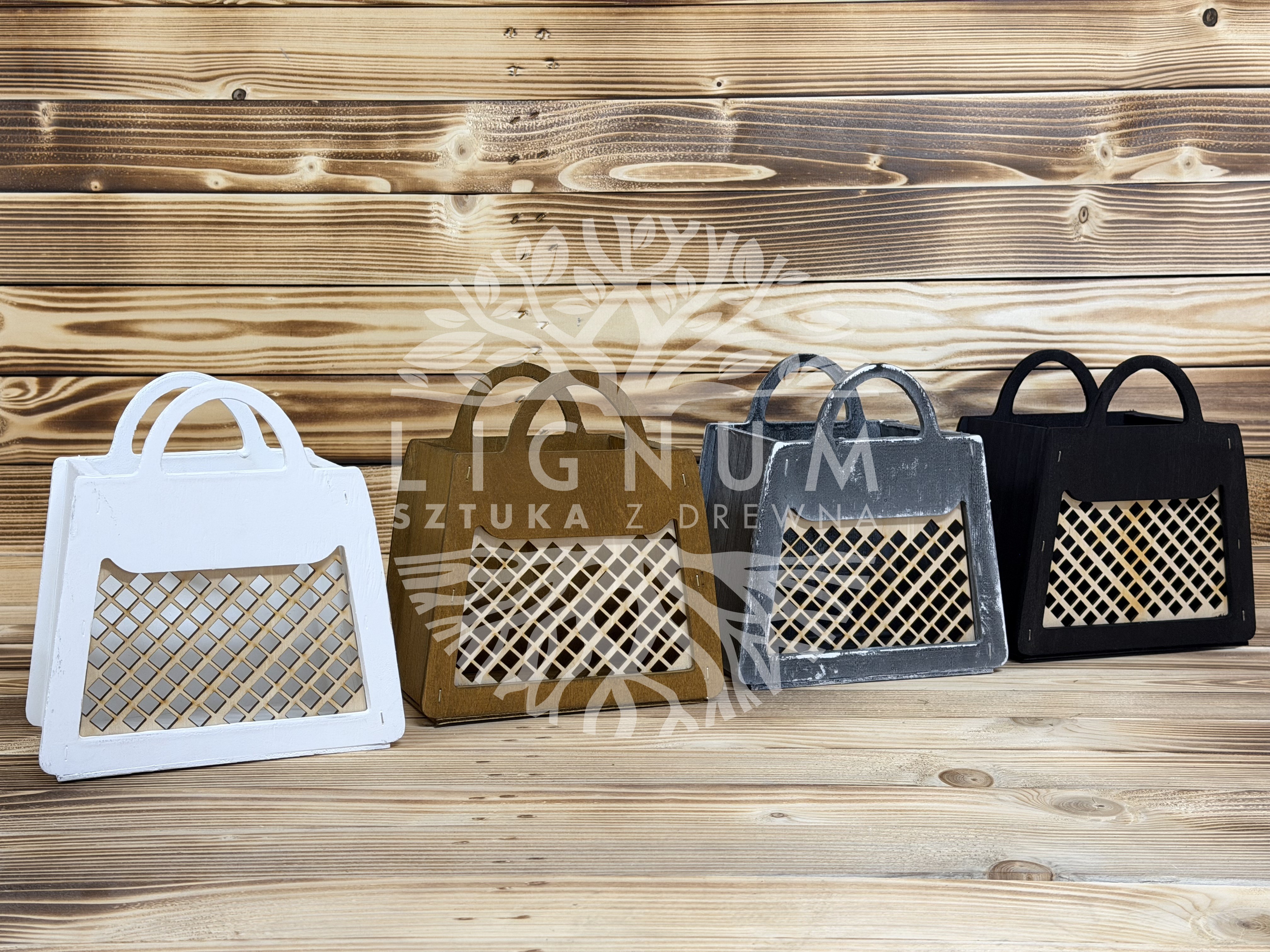 Drewniany Flower Box ażurowy KRATKA / Kosz prezentowy HANDMADE z uchwytem