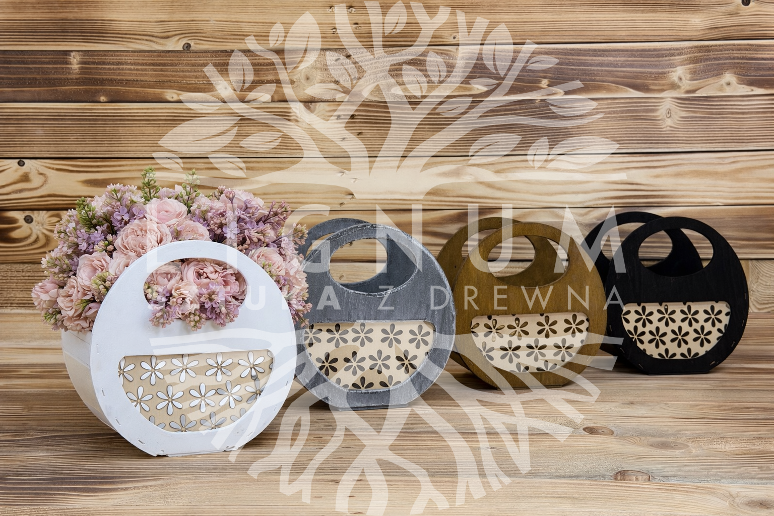 Drewniana torebka prezentowa „Bloom – Kwiaty” to połączenie naturalnego drewna, ręcznego wykonania i subtelnego, kobiecego wzoru kwiatowego.